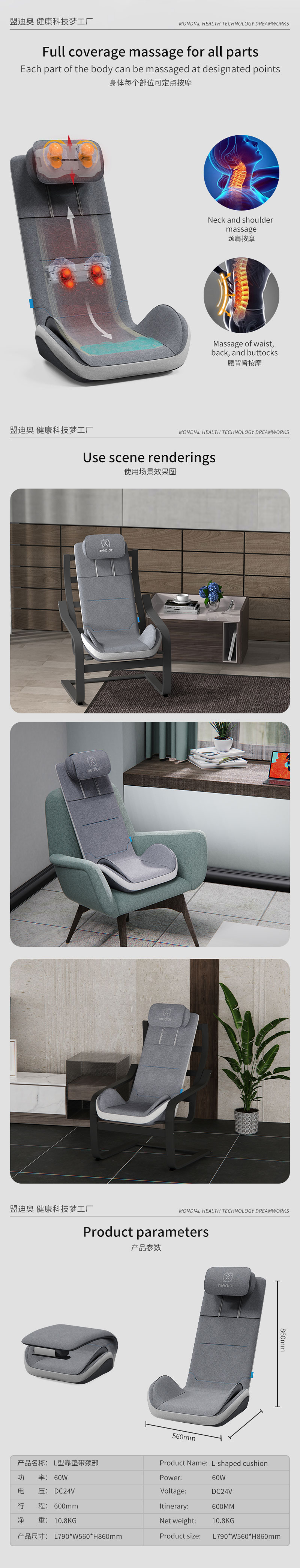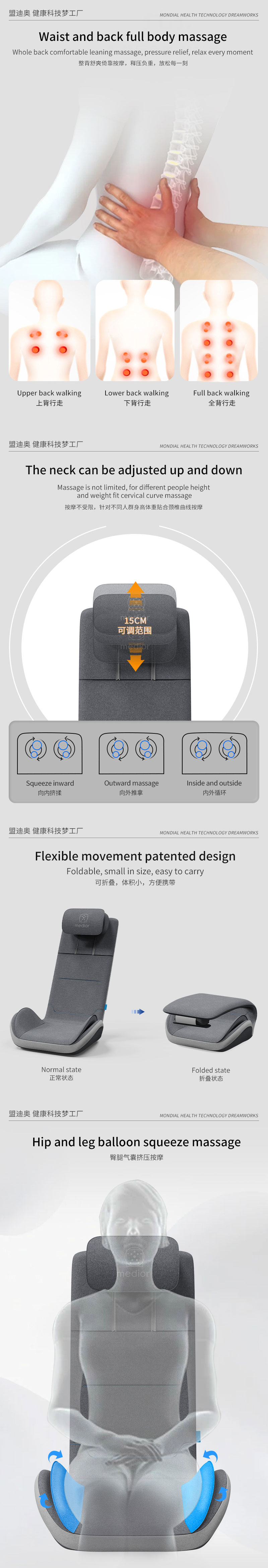 1、L型機(jī)芯結(jié)構(gòu),對(duì)折包裝縮小體積2、獨(dú)家專利柔性機(jī)芯3、力度三檔調(diào)節(jié),定點(diǎn)按摩,腰背按摩、臀腿按摩、全背按摩模式選擇4、背部行走揉捏,按摩區(qū)域加長到從肩膀到大腿;5、更加貼合不同款式的椅子整體可對(duì)折收納